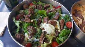 스테이크, 로메인  상추, 양파, 토마토, 아보카도 등을 이용하여